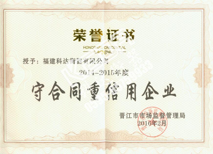 福建科達衡器有限公司榮獲2014-2015年度“守合同重信用企業(yè)”榮譽稱號