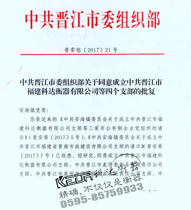 中共晉江市委組織部關(guān)于同意成立中共晉江市福建科達(dá)衡器有限公司支部的批復(fù)