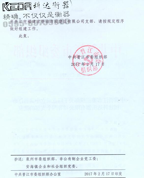 你委送來的《中共安海鎮(zhèn)委員會關(guān)于成立中共晉江市福建科達(dá)衡器有限公司支部等三家非公有制企業(yè)黨組織的請式》