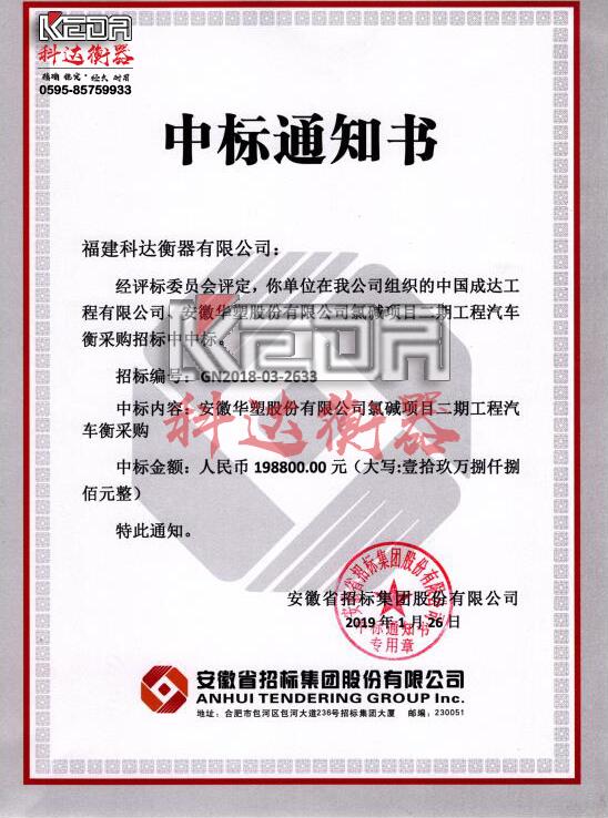 熱烈祝賀福建科達(dá)中標(biāo)安徽氯堿項(xiàng)目汽車衡采購(gòu)